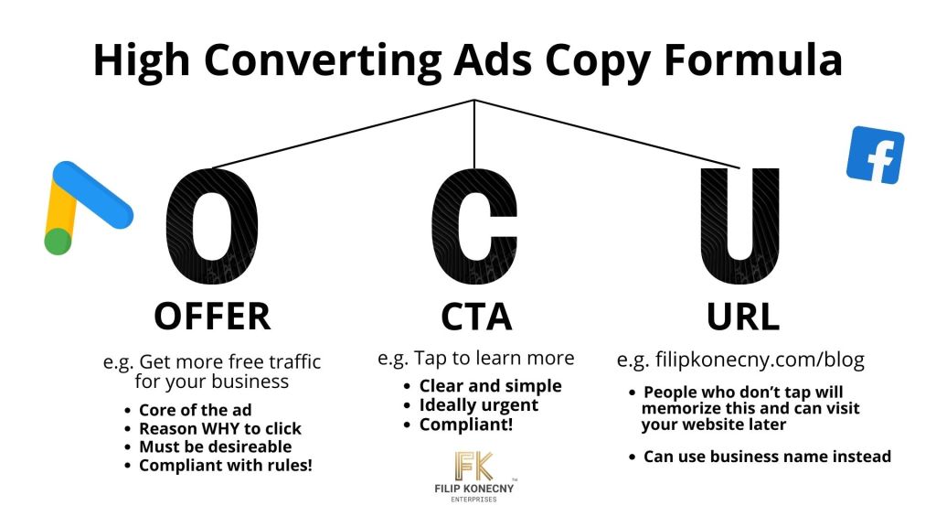 - Offer: This is the most important part of your ad. You want to share whatever it is they’re going to get after they click the ad. What is the promise? What is the thing that you offer that they desire? Share it in your ad copy. (e.g. Get more website traffic, get your leaked roof fixed in 24 hours, etc.)